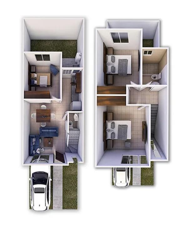 La casa cuenta con 2 habitaciones en planta alta y un baño completo.